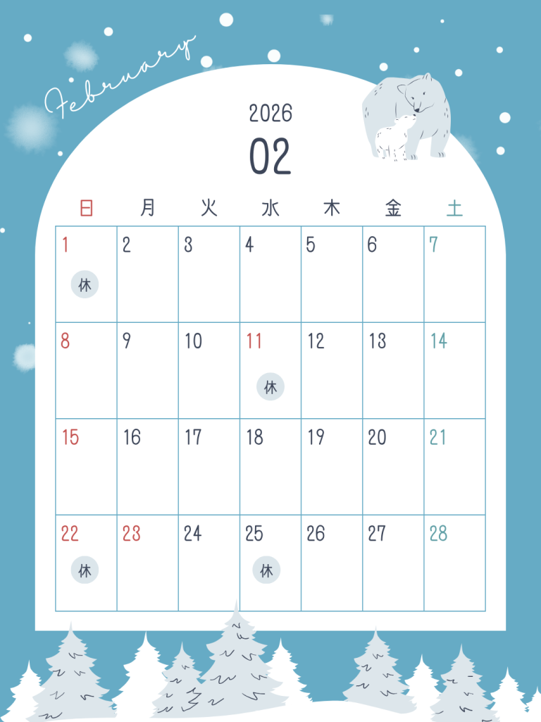 お知らせ2026/01/17 2月の診療日のお知らせです。 1,11,22,25日は休診となっており、4,8,15,18日は午前診のみとなっております。23日は17時までとなっております。寒い日が続きますが体調にはお気をつけてお過ごしください!ご来院お待ちしております。